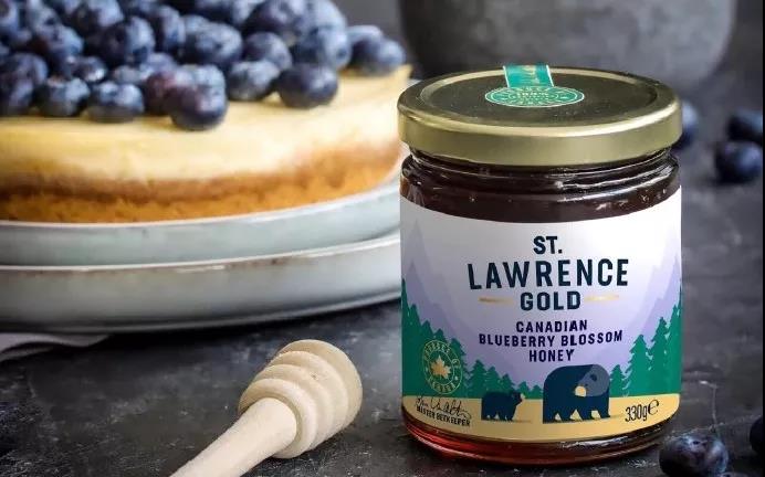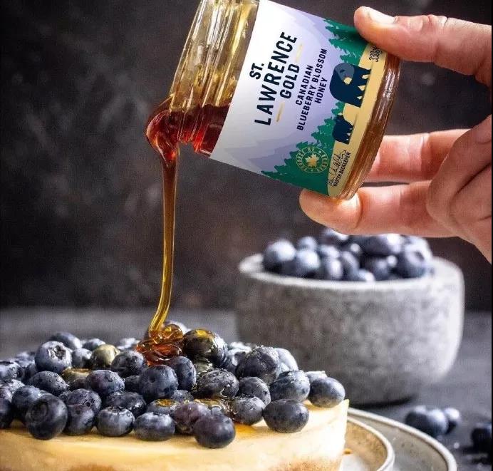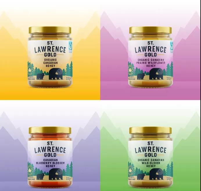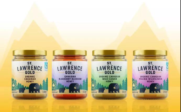 瓶貼插圖描繪了加拿大的戶外場(chǎng)景以及山脈、松葉林,還有可愛(ài)的為蜂蜜著迷的黑熊母子。